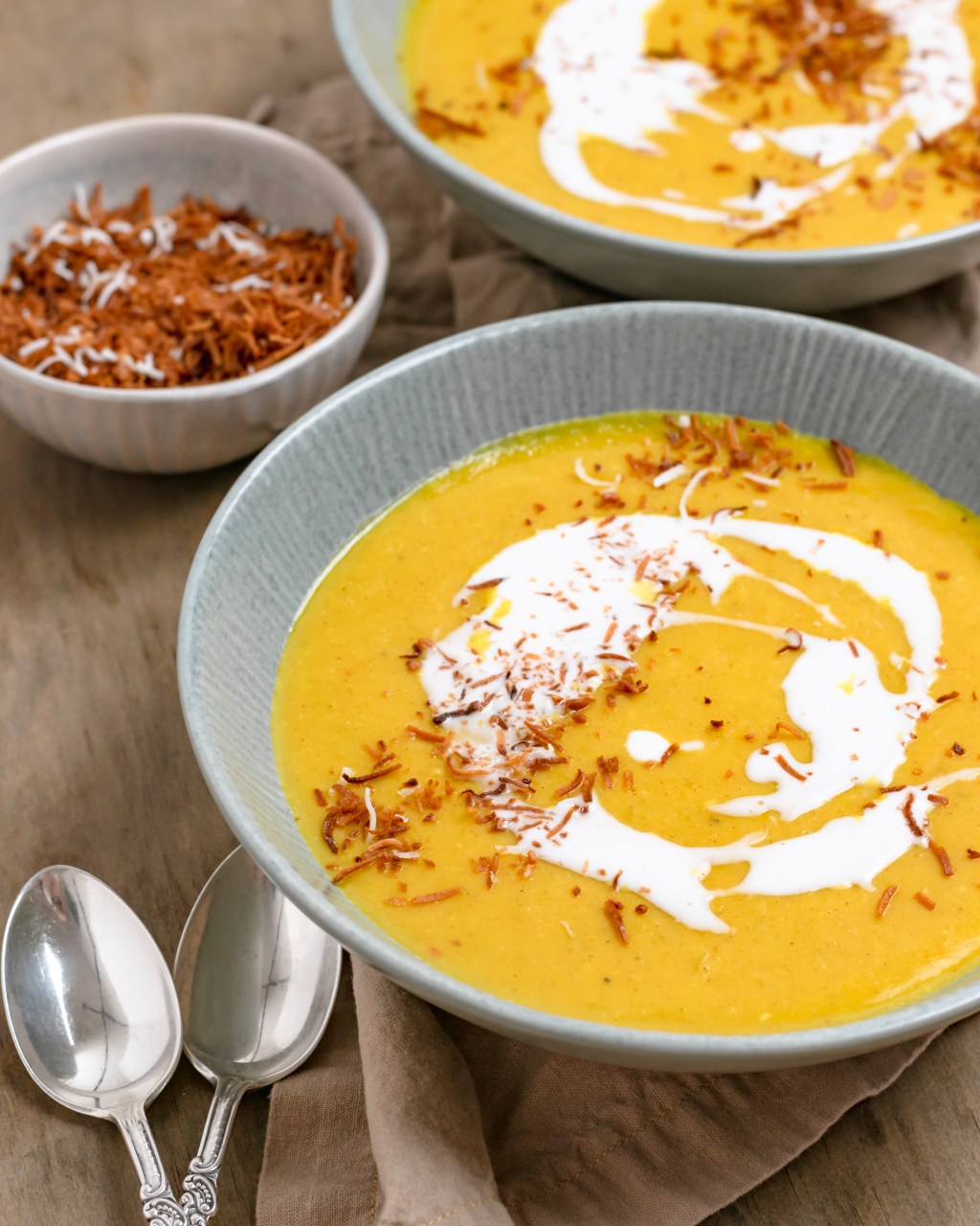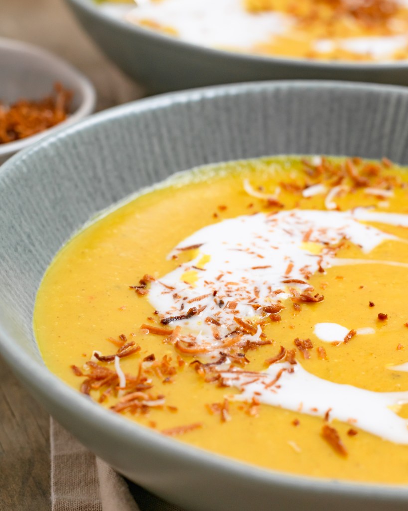 Butternut squash, celery and onions sautéed with lots of curry powder and garlic then simmered in coconut milk. Super creamy and so delicious. A perfectly cozy soup.