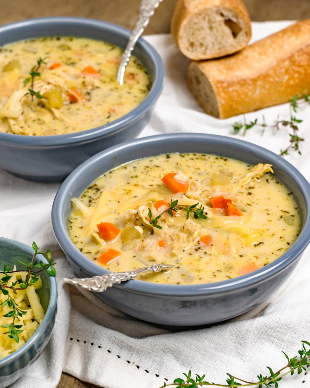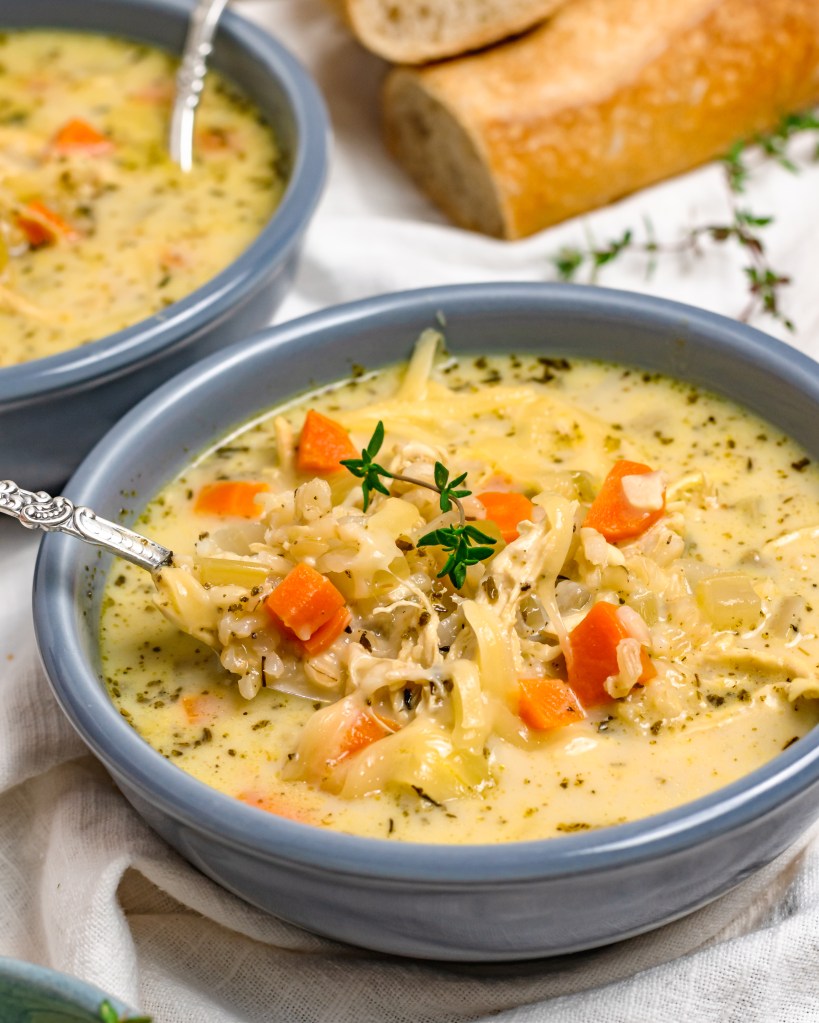 Cozy and comforting to the max! Thyme, sage and garlic sautéed with onions, carrots and celery then simmered with rice and shredded chicken in a gouda infused broth. This soup has some serious flavor and is super easy to make. You gotta try it!