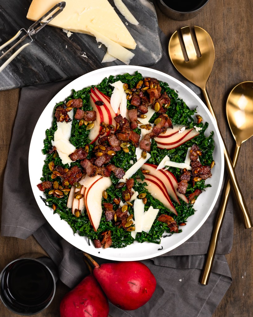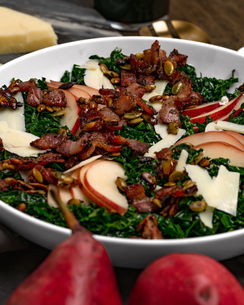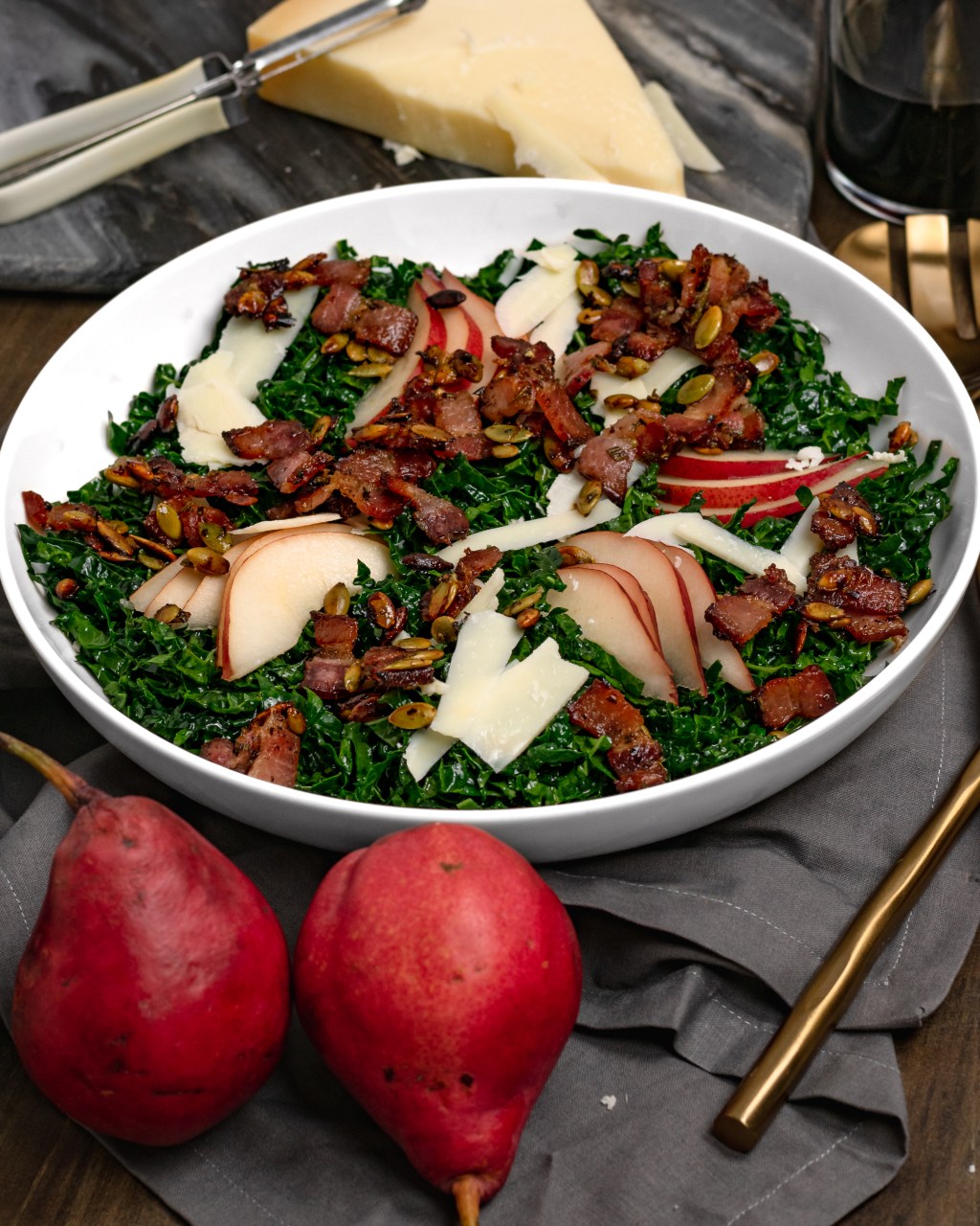 A hearty kale salad with tender, sliced pear, shaved parmesan and crispy maple-rosemary candied bacon and pepitas, finished with a little apple cider vinegar. A festive, delicious and healthy addition to any table this season!