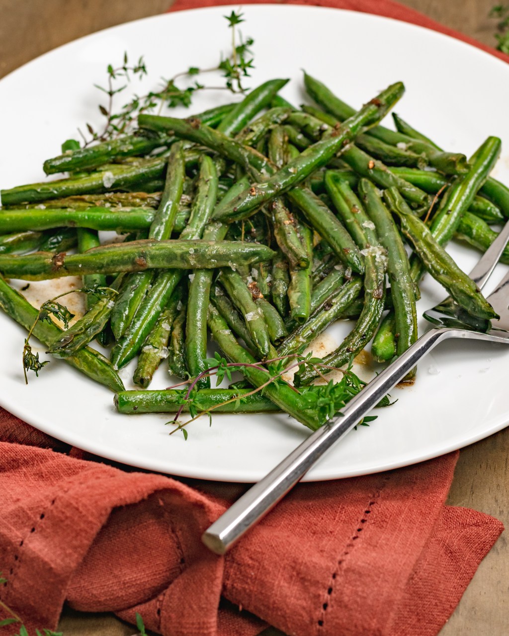 Fresh green beans sautéed in thyme infused butter until just charred on the outside and tender with a little crunch on the inside. Finished with a touch of sea salt. Perfectly delicious, quick and easy to make. The best side dish for the holidays!
