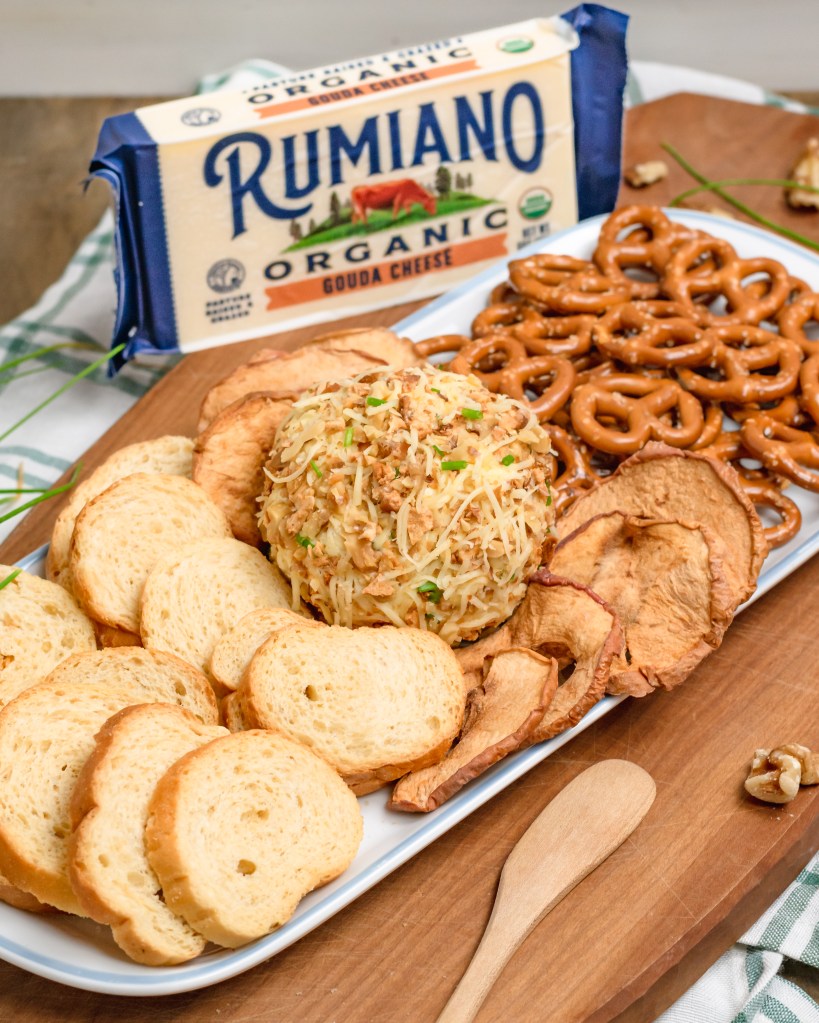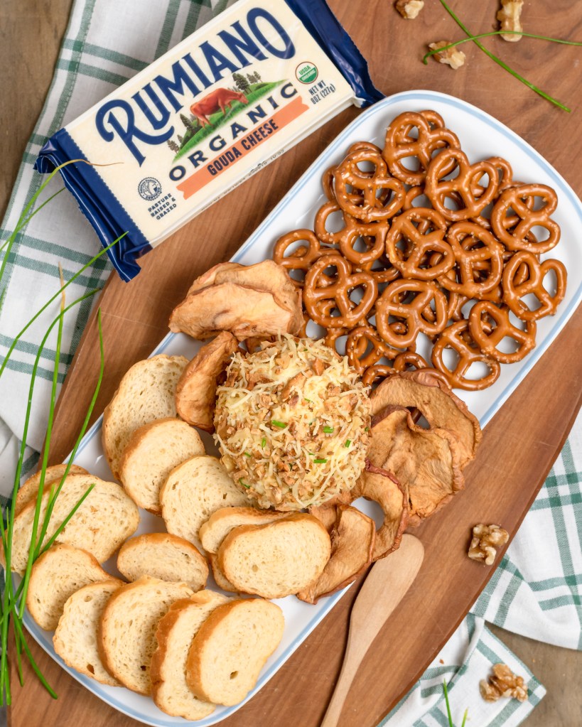 I love bringing back old school favorites for the holidays and this Gouda and Apple Cheeseball does not disappoint! Lots of shredded gouda, a little stone ground mustard and chives held together with some cream cheese then rolled in apple chips and walnuts.