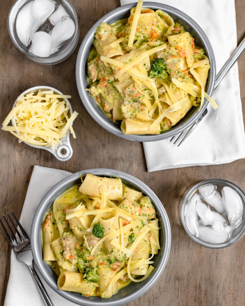 This cozy mash up is the ultimate one pot meal! Broccoli, carrots and onion sautéed with ground turkey, garlic and thyme then simmered with pasta and finished with a little cheese swirled in. So flavorful and cheesy with lots of protein and veggies packed in too! You’re gonna love it.