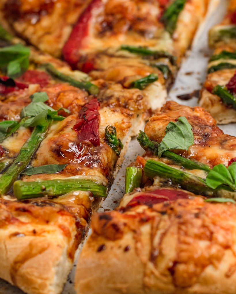 A fun and festive pizza that is absolutely to die for! Tender asparagus and sweet red bell pepper over a classic cheese pie finished with a balsamic drizzle. So balanced and delicious!