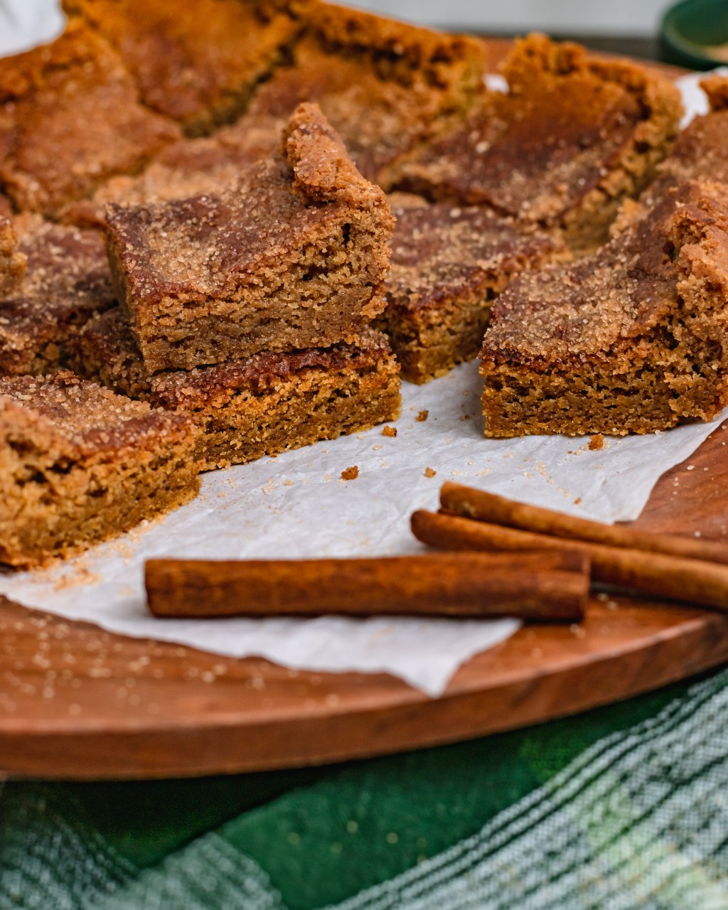 Rich, toasty brown butter blondies covered in cinnamon sugar. Chewy with just a little crunch on the outside. Literally all the delicious goodness we crave from a snickerdoodle wrapped up in a quick and easy blondie. So festive and tasty!