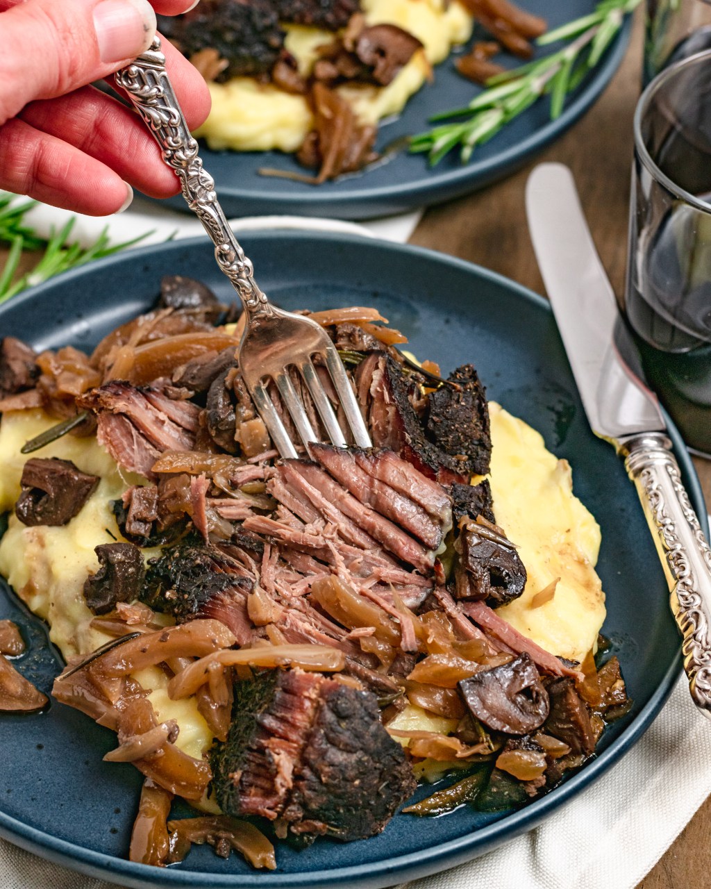 Easy, elegant and crazy flavorful. Roast beef seasoned with lots of thyme and clove simmered over sliced fennel and mushrooms in red wine, rosemary and garlic. The beef completely falls apart while maintaining just a little crust on the edges, the perfect accompaniment to some tender, saucy fennel and mushrooms. So darn delicious!