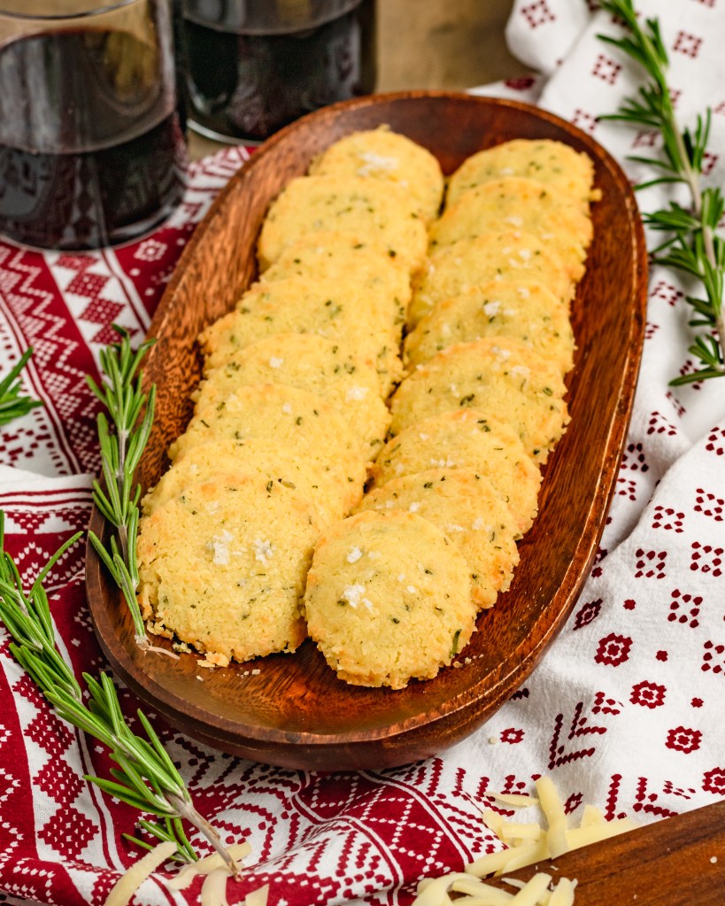 Cheesy, buttery, crisp little crackers loaded with rosemary and finished with flakey sea salt. A little fancy and super easy to throw together. Perfect for the holidays!