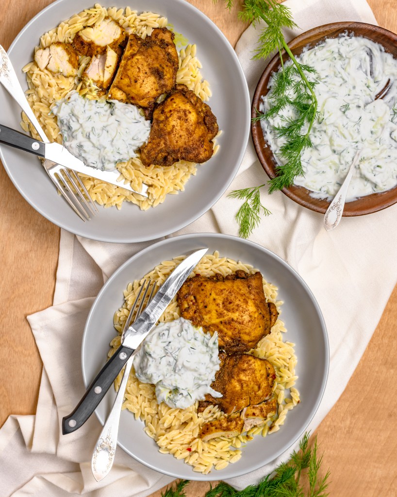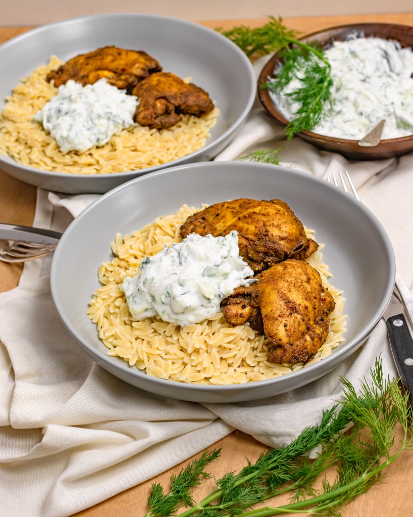 Spiced up and so delicious, this high protein dinner is an all time favorite. Perfectly cooked chicken thighs coated in lots of spices, cooled down with a cucumber, dill, greek yogurt sauce. Such a tasty combination of flavors, you just can’t stop eating it!