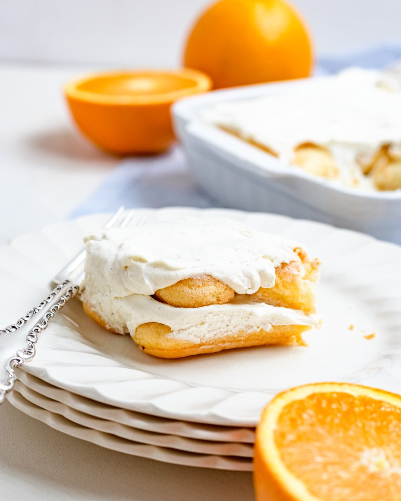 Dunk lady fingers in the orange juice mixture for 1-2 sec per side, one at a time until you fill the bottom of a 5×5/6×6 dish. Spread half of the mascarpone mixture over the to cover then repeat for a second layer.