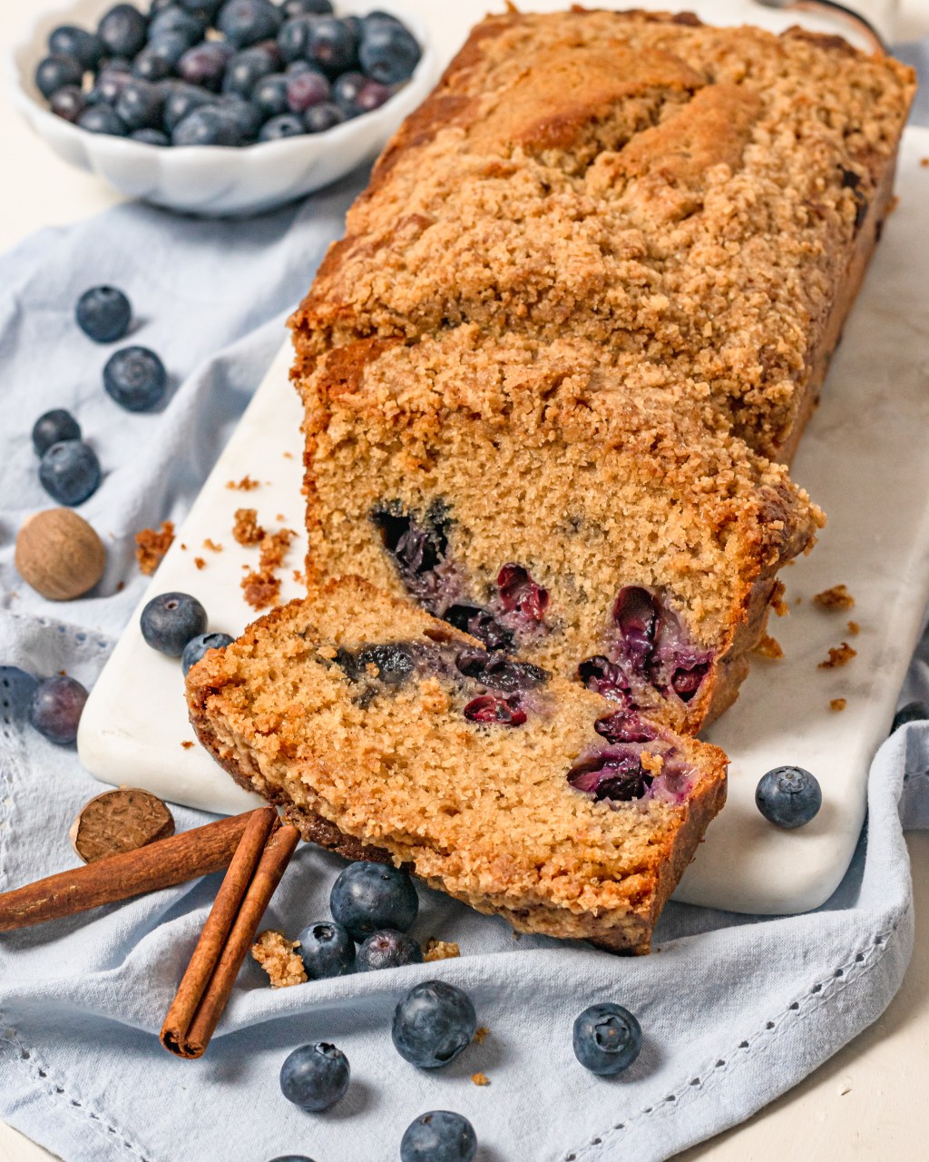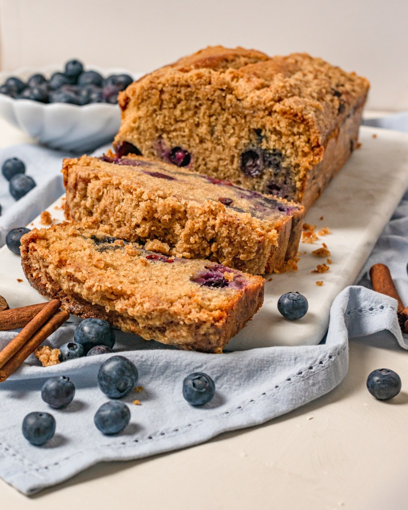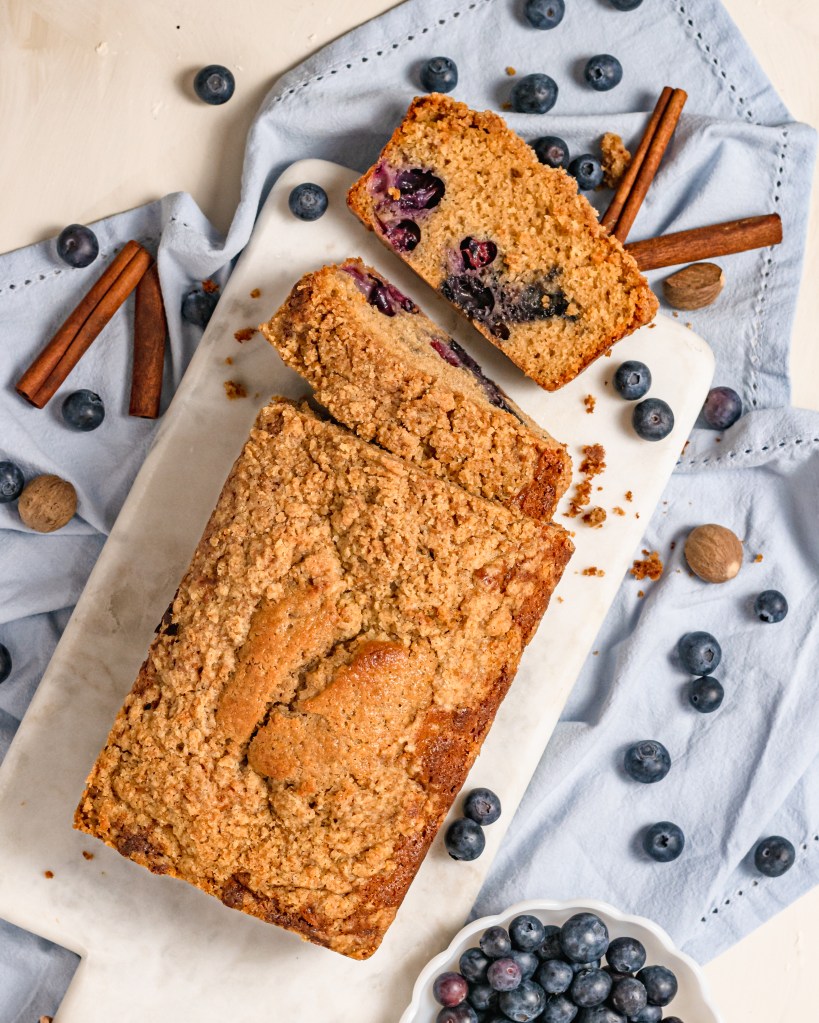 A delicious and delicately sweet way to start the day. Blueberries folded into a fluffy, cinnamon and nutmeg laced cake, topped in crunchy sweet streusel. Nothing goes better with a fresh cup of coffee. So good!