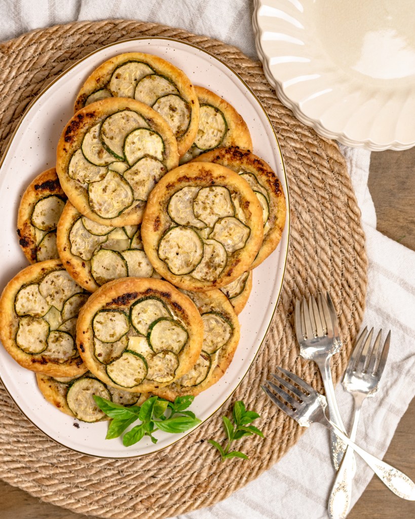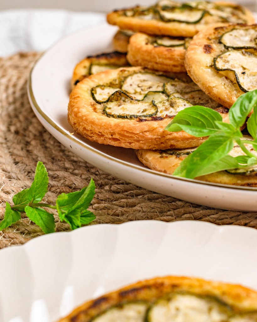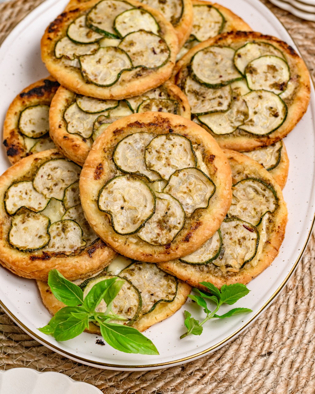 In the summertime, I can eat these for any meal with a massive vinaigrette-y salad on the side. Perfect, flakey pastry rounds topped with fresh mint and basil pesto, gooey brie and thin sliced zucchini. Delicious, decedent and super easy to make! So good.