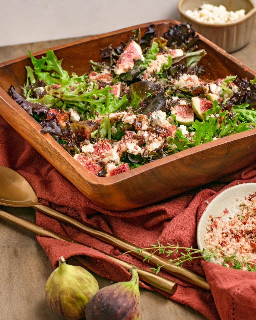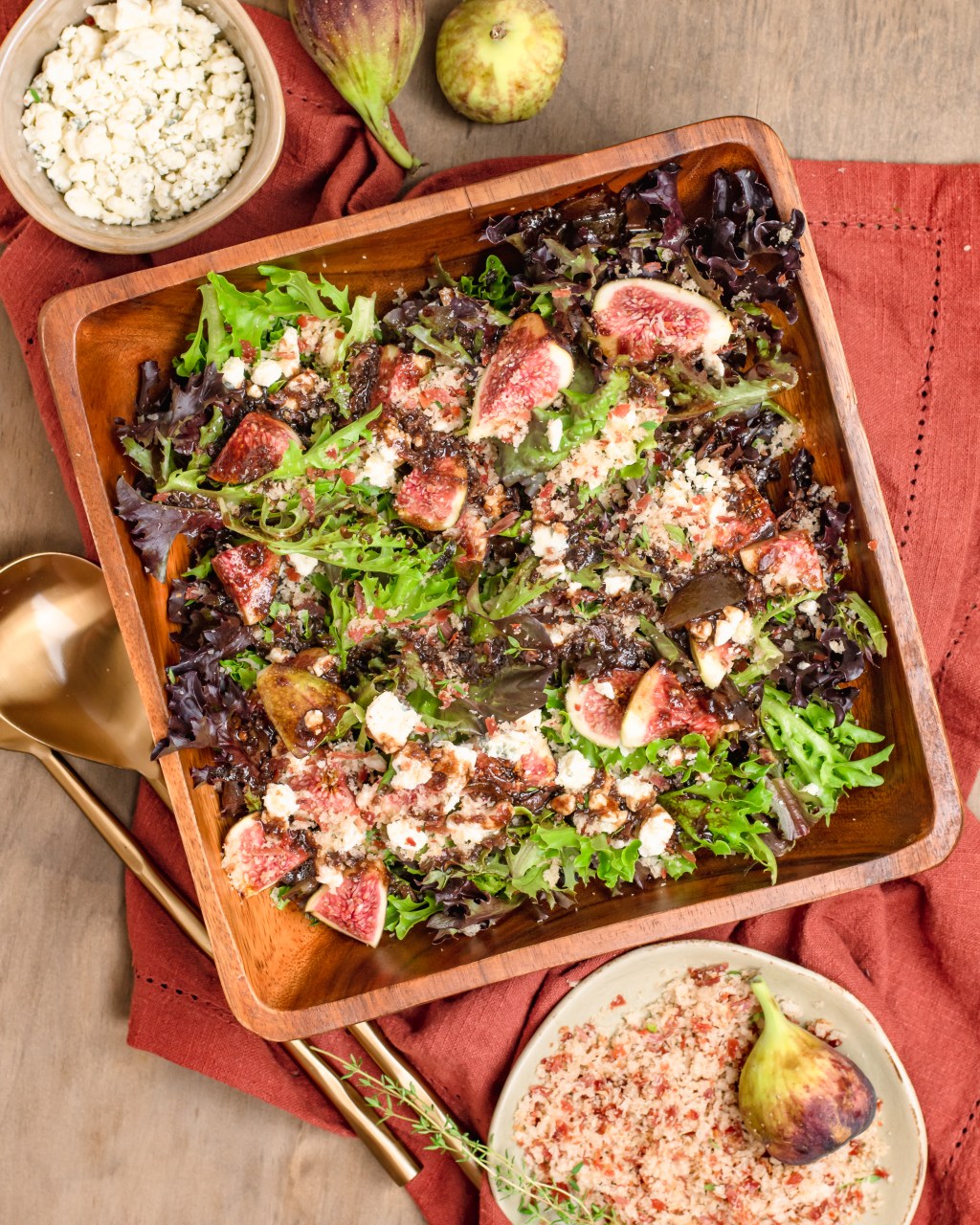 What better way to celebrate the end of summer than this simple but flavorful fresh fig salad! Zesty gorgonzola atop a bed of greens with some gorgeous figs, sprinkled with crispy prosciutto, thyme breadcrumbs drizzled with a quick balsamic vinaigrette. Quick, easy and stunning.