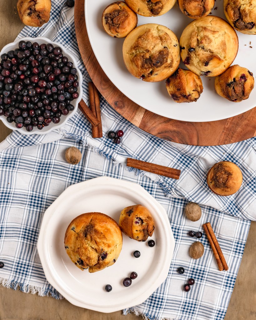 Summer blueberries shine in these delicious and easy to make muffins. Simple muffins loaded with blueberries and a little cinnamon nutmeg swirl. So good. They disappear so fast!