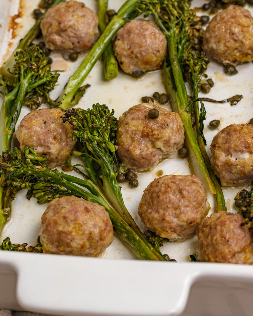 Pull the baking dish from the oven then distribute the broccolini in between the meatballs. Pour lemon juice and capers over the top then roast for another 20 minutes.