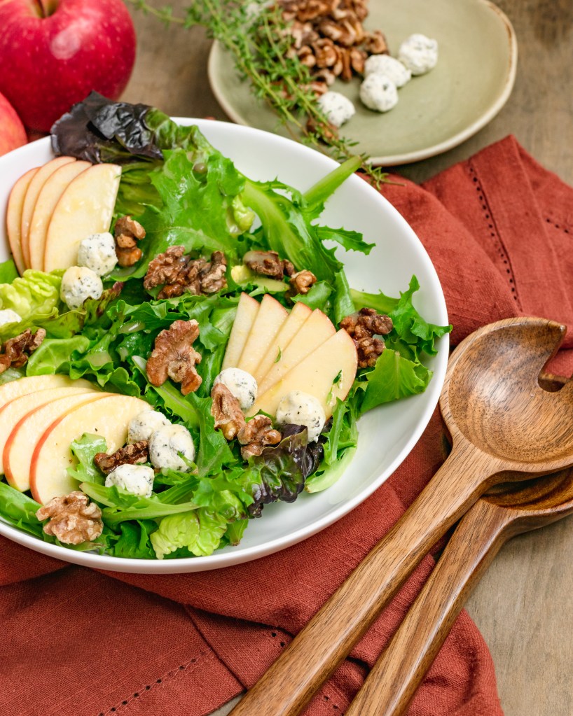 Let’s dive into some Fall flavors with this fabulous and easy to make salad! Thin sliced apple, toasted walnuts and little balls of Boursin cheese over fresh greens tossed in a delicious honey mustard thyme dressing. So so good!