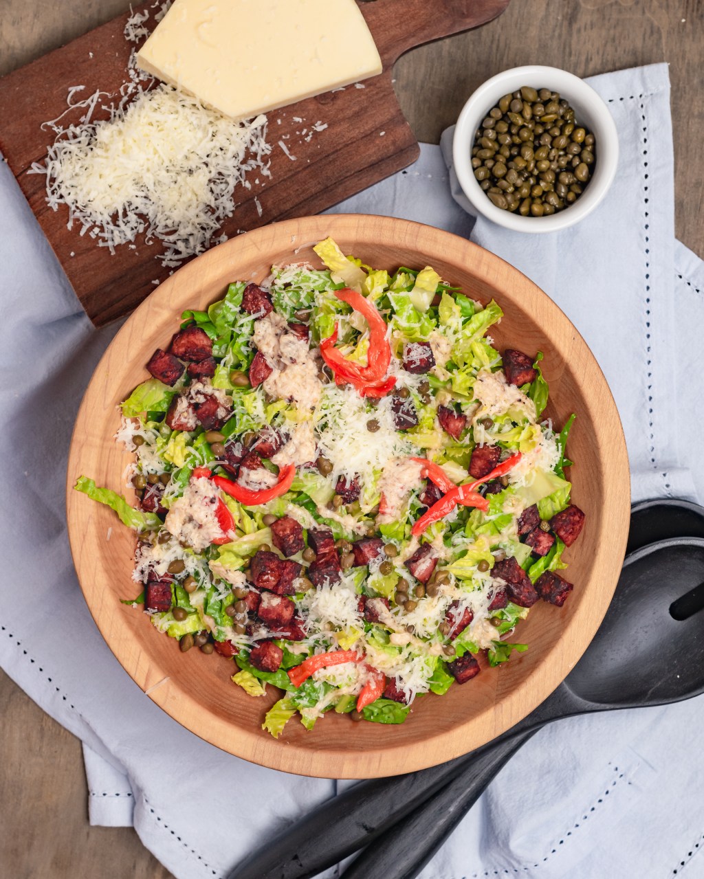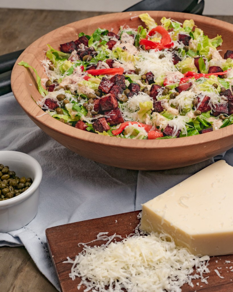 Toss the romaine in a large bowl with about half of the dressing. Top with roasted bell pepper, capers, fried salami and some more asiago, then finish with the remaining dressing.