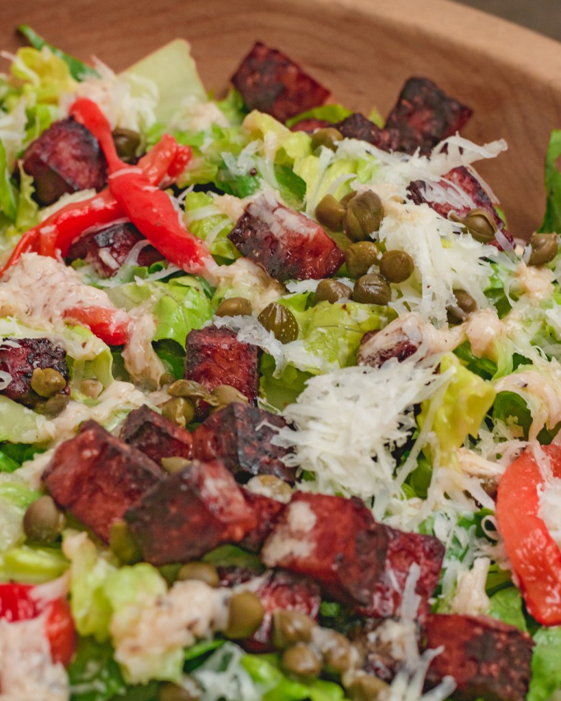 Making salami croutons a thing with this fabulously flavorful salad! Fresh romaine tossed in a tangy asiago dressing and topped with roasted bell pepper, capers and lightly fried salami cubes. Delicious and so fun!