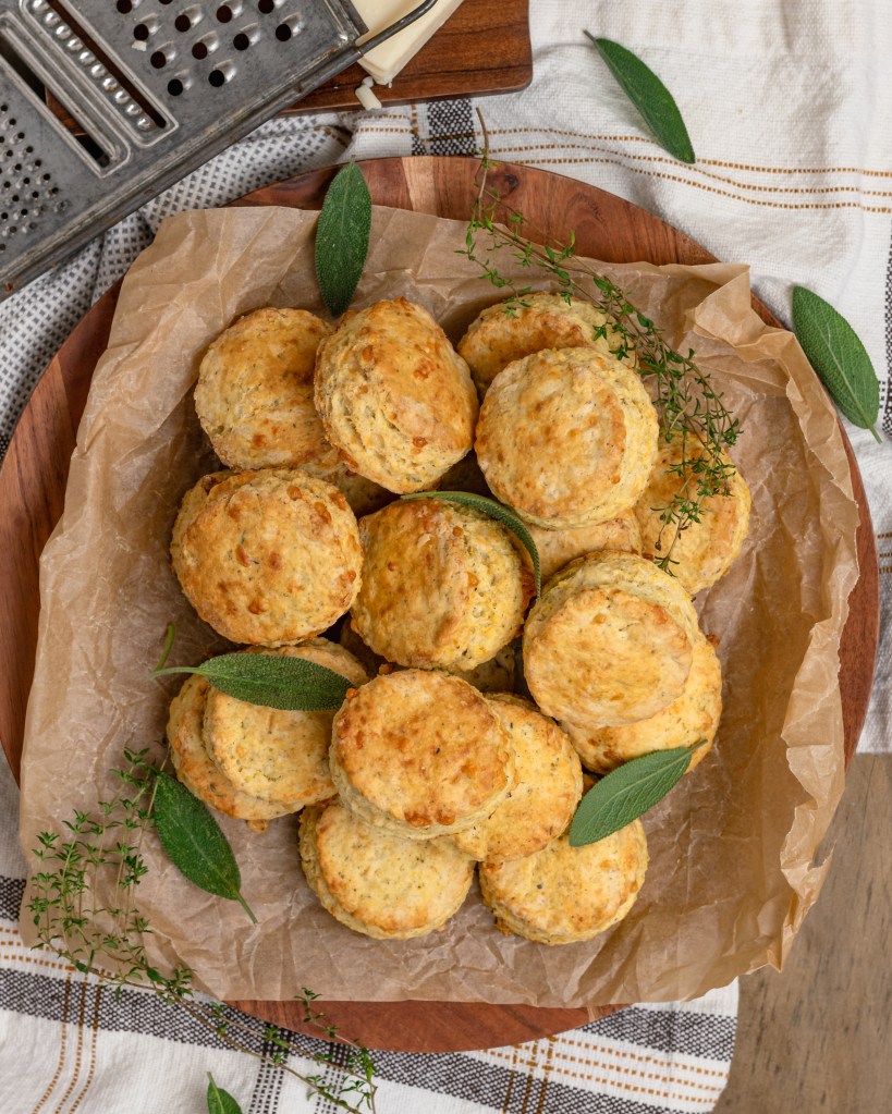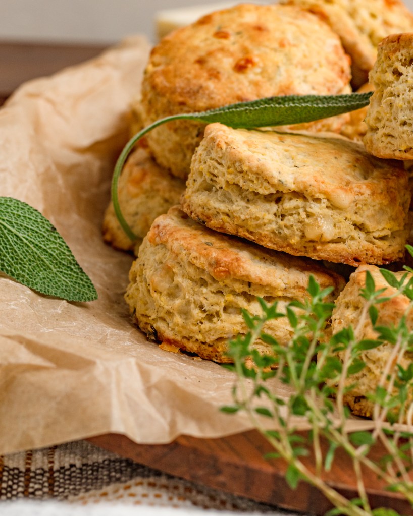 The perfect cozy side. Buttery, super herby biscuits with shreds of white cheddar and a little extra cornmeal crunch. Delicious with any Fall meal.