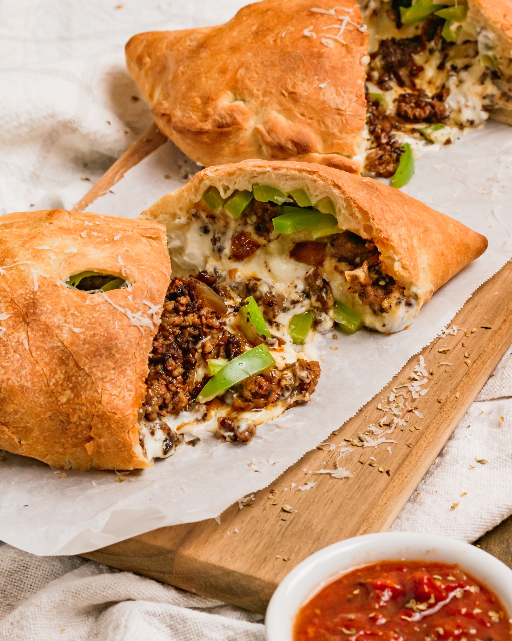 Think sausage and pepper sandwich but make it a calzone! (Even better!) Italian sausage crisped up with a little onion then wrapped in pizza dough with fresh green bell pepper and lots of garlicky, gooey cheese. Perfect little pockets of delicious goodness.