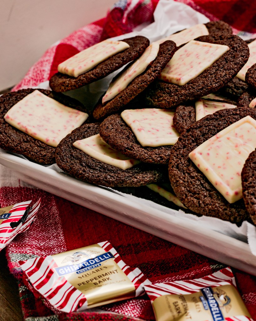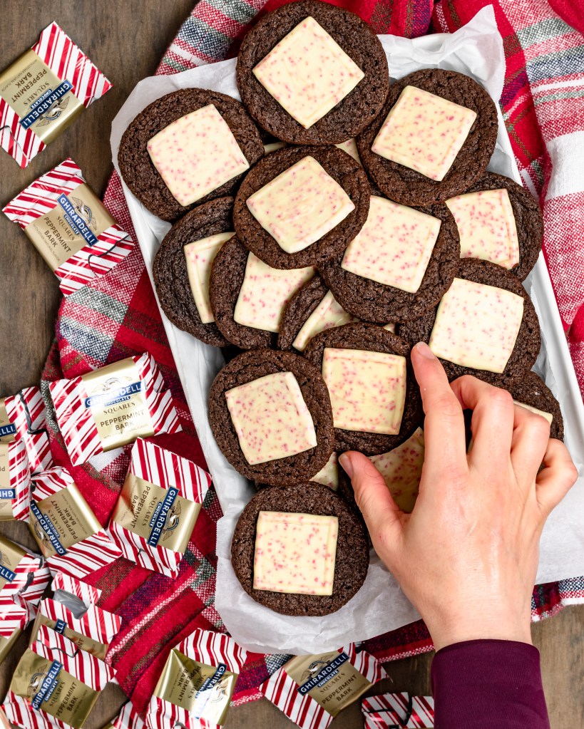 My new favorite Christmas cookie! Super chocolatey, almost fudgey, brownie inspired cookies topped with a square of peppermint bark. Freaking amazing. Santa would agree!