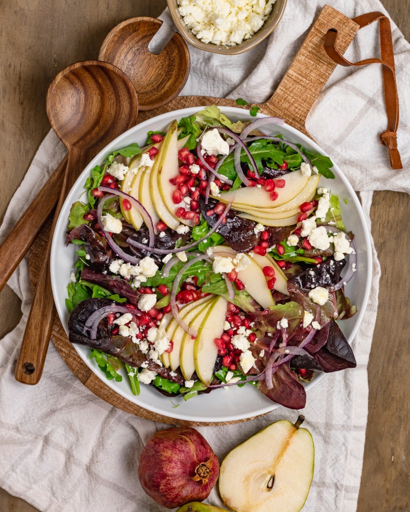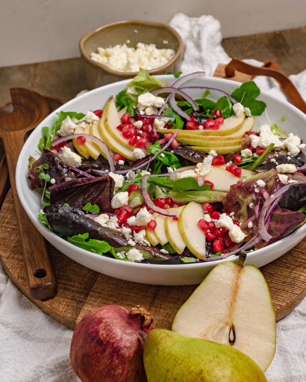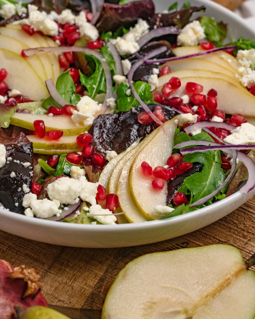 A perfect combination of sweet, salty and tangy all in one delicious and healthy salad! Fresh greens tossed in a quick and easy white balsamic dressing topped with sliced pears, juicy pomegranate seeds, thin ribbons of red onion and crumbled feta. Incredibly refreshing and so flavorful.
