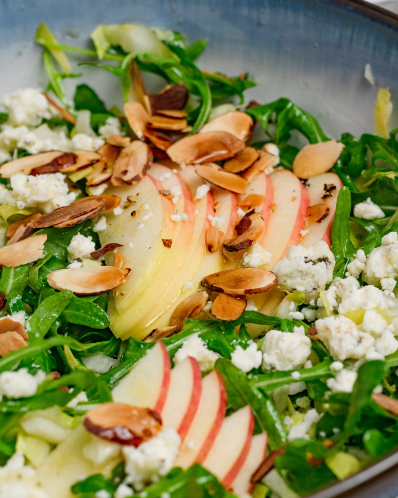 A crispy, fresh way to help brighten up these cold winter days. Crunchy endive tossed with arugula in a light vinaigrette then finished with thin sliced apples, toasted almonds and crumbled gorgonzola. Clean and delicious.