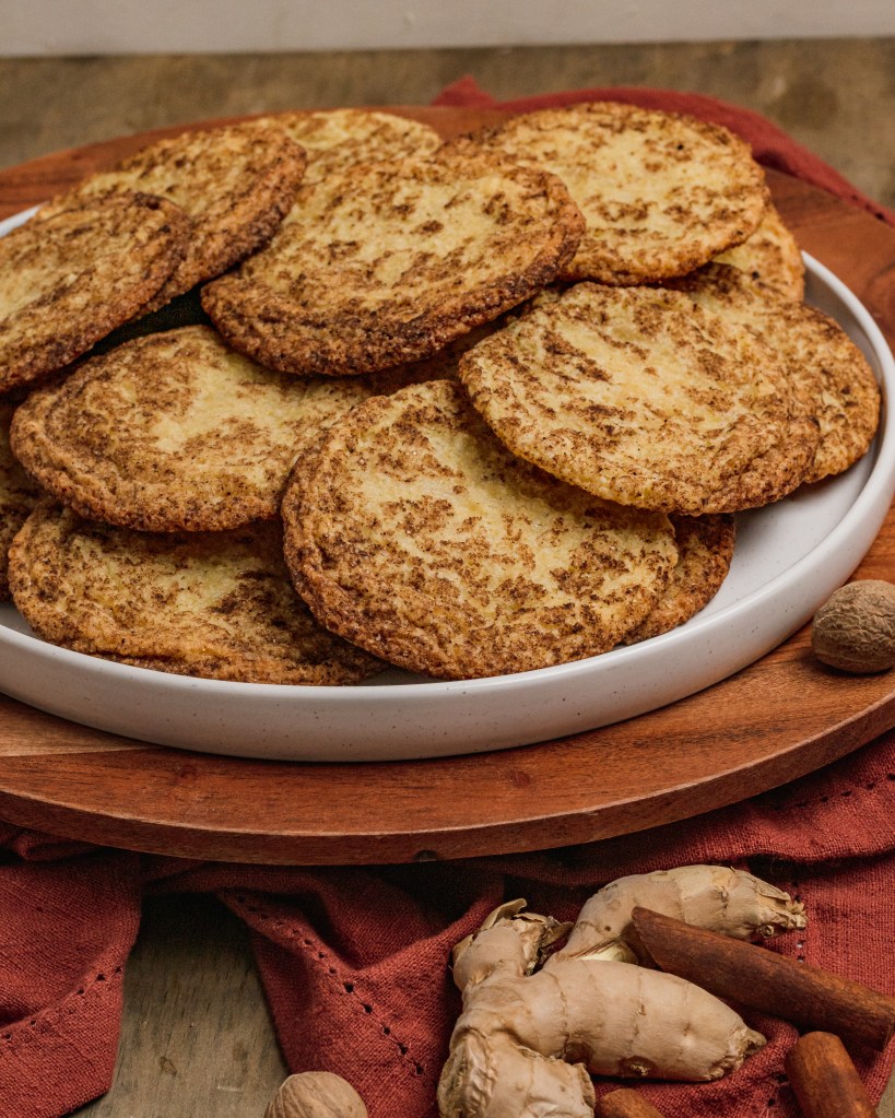 In a small bowl, stir together cinnamon, cardamom, ginger, allspice, clove, nutmeg, black pepper and 3T sugar. Scoop cookie dough into about 1″ balls, roll between your palms to smooth then roll in the spiced sugar until fully coated. Place on a large plate and refrigerate for 1-2 hours (or freeze for 20 minutes).