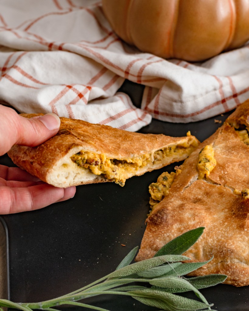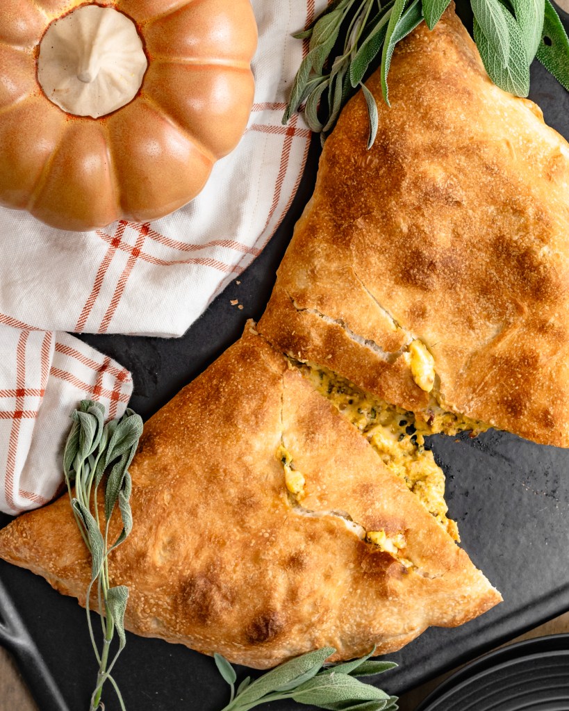 Happy Halloween! The quintessential Fall calzone. Crispy sausage, lots of sage and garlic, creamy pumpkin and Italian cheeses wrapped up in a the best pizza dough. Perfect for any night this Fall.