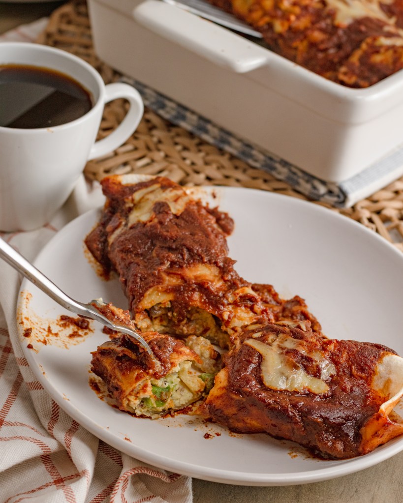 Breakfast for a crowd that absolutely everyone will LOVE! Crispy sausage, sautéed veg and cheesy eggs rolled up in tortillas and smothered in a homemade enchilada sauce. So delicious and filling!