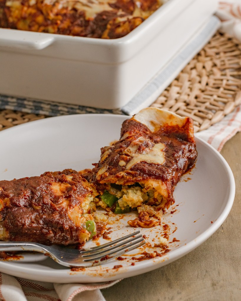 FREEZER: Make a double batch. Line one (or both if freezing two) baking dishes with foil before adding enchilada sauce. Assemble as directed above then top with a second piece of foil and tightly roll up the sides, pressing all the air out and sealing well. Put in the freezer for 8 hours then pop it out of the dish and transfer the packet to a freezer bag.