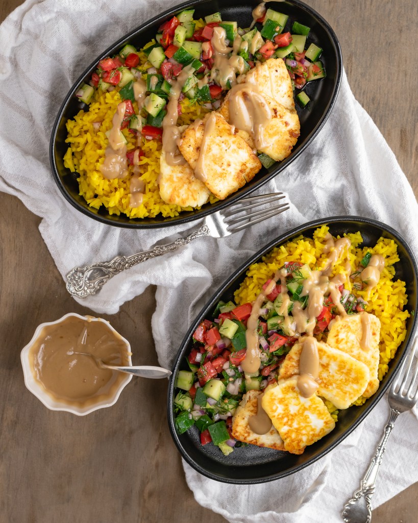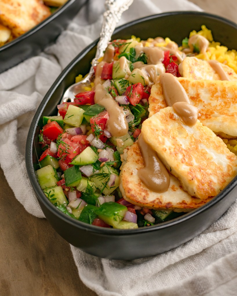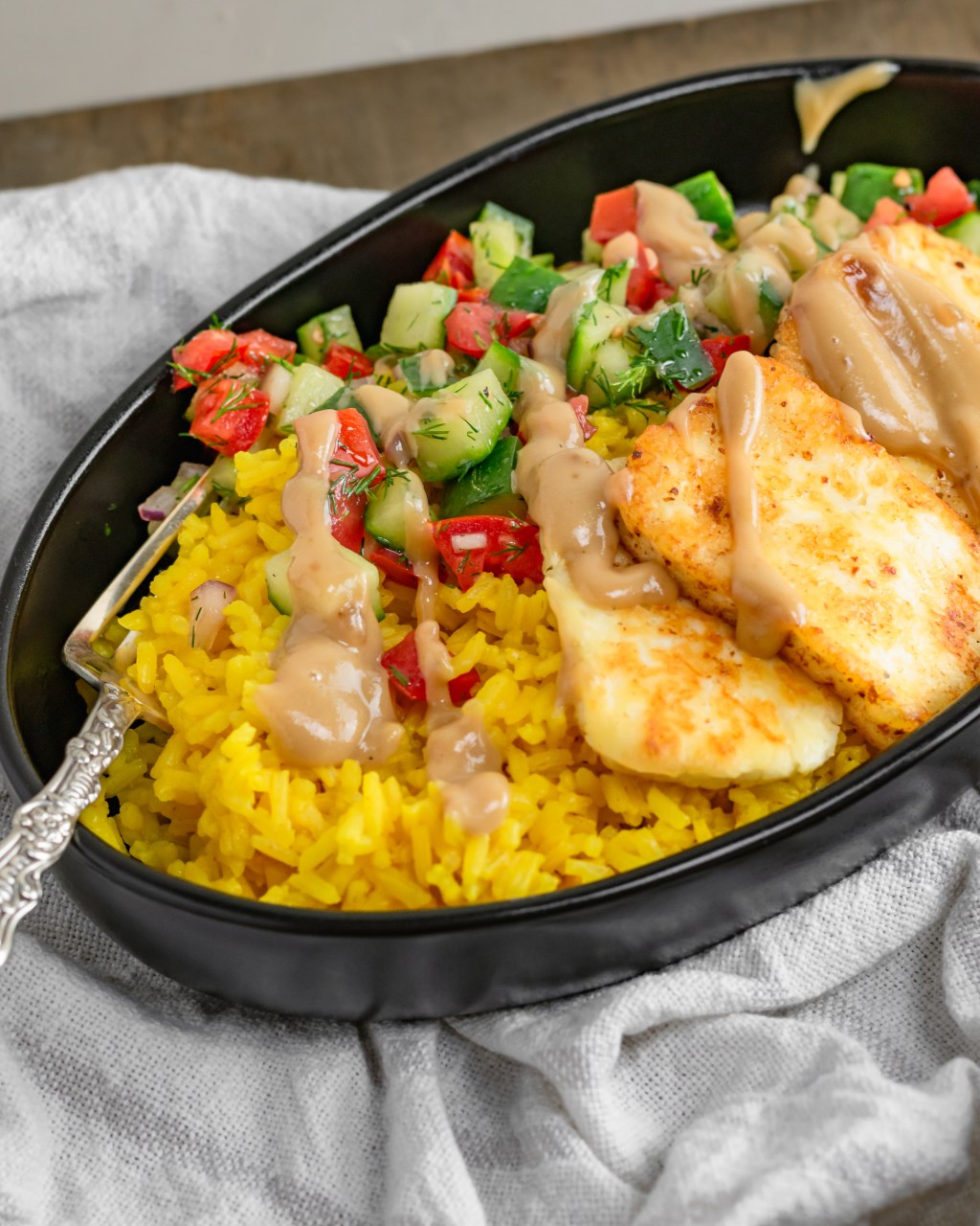 Fresh and flavorful is an understatement! Crispy pan-fried halloumi and a fresh, dilly tomato, cucumber salad over bright turmeric ginger rice, finished with a spicy sweet hot honey tahini drizzle. So freaking good.